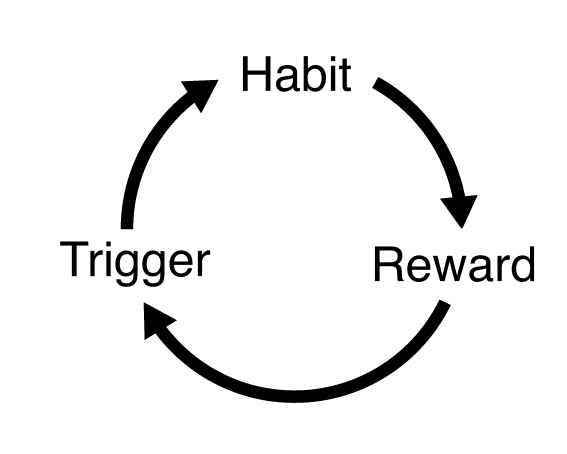 The cycle is surprisingly simple.  We receive a cue that triggers the habitual behavior.  When we perform the routine behavior triggered by the cue, we get the reward as an automatic benefit from the routine.